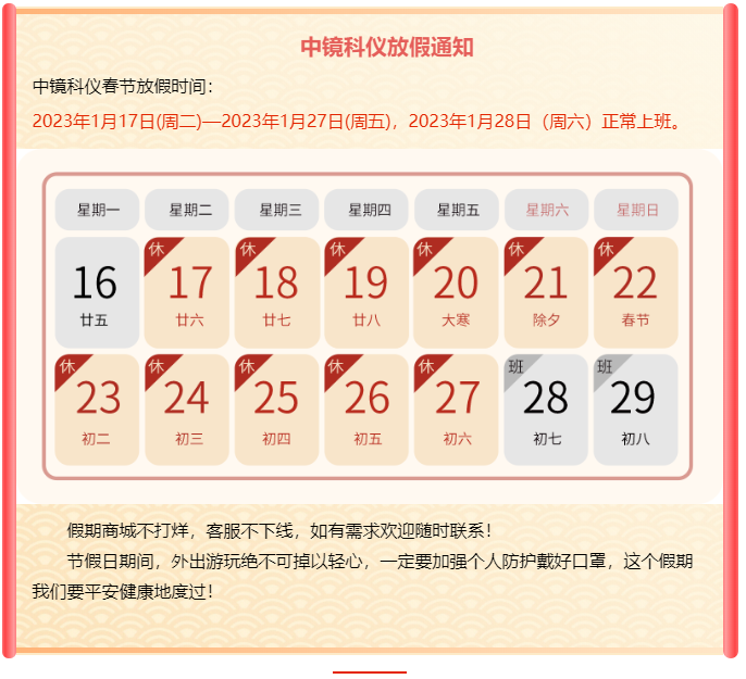 玉免迎春至,黃鶯報喜來。值此新春佳節(jié)來臨之際,中鏡科儀攜全體員工謹向長期以來關心、支持、信賴我們的各級領導、老師、社會各界朋友、廣大客戶以及合作伙伴,致以衷心的感謝和美好的祝愿! 逐漸遠去的2022年,我們歷經(jīng)困難與挑戰(zhàn),我們收獲成長與喜悅。加速奔來的2023年,中鏡科儀全體同仁將繼續(xù)振作精神、踔厲奮發(fā)、勇毅前行,全方位推動公司高質(zhì)量發(fā)展行穩(wěn)致遠,再創(chuàng)中鏡科儀新輝煌! 最后,祝大家在新的一年里闔家幸福、身體健康、萬事如意、新年快樂!