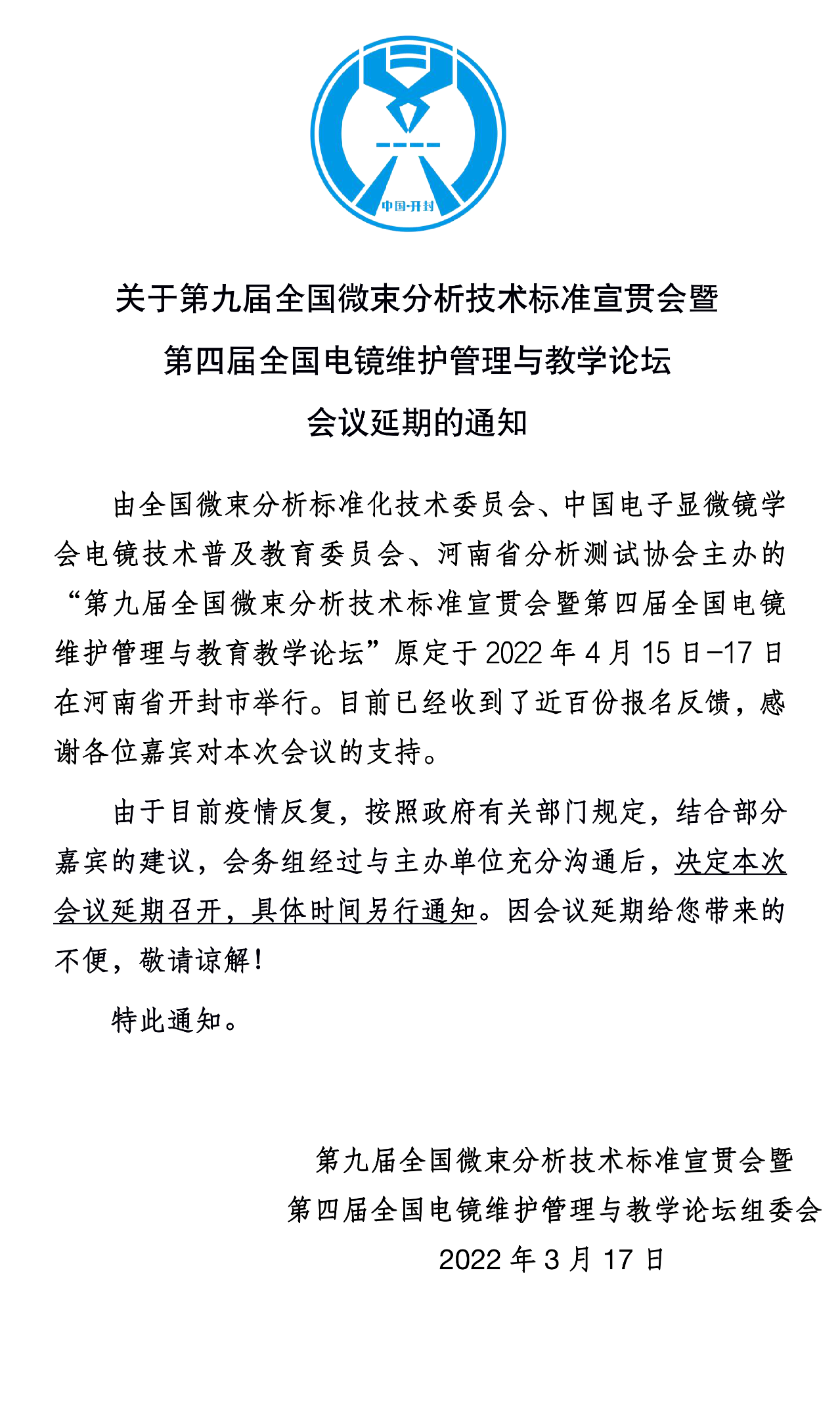 【延期通知】關于第九屆微束分析標準宣貫會暨第四屆全國電鏡維護管理與教學論壇會議延期的通知