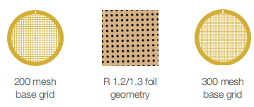 Better 3D reconstructions from less data with ultra-stable gold supports that reduce the movement of frozen specimens during imaging. During imaging at cryo-temperatures, traditional carbon supports move,particularly at the beginning of irradiation. This movement blurs images and reduces data quality. UltrAuFoil? sample supports are more conductive,and there is no differential contraction between the grid and the foil on plunge freezing. Therefore there is less crinkling of the foil during sample preparation. UltrAuFoil? R 1.2/1.3 For high-resolution transmission electron microscopy So you benefit from 1 So you benefit from Up to 0.5 ? increase in resolution on replacing traditional holey carbon supports with UltrAuFoil?.1 2 The highest resolution data from your initial movie frames before radiation damage accumulates, due to reduced beam-induced motion.2 3 3 Reduced image distortion because of lowered static and semi-mobile charge accumulation as gold is highly conductive at liquid nitrogen temperatures.2 4 Samples protected from damage due to accumulating positive charge by neutralization with secondary electrons generated by irradiating adjacent gold.2 5 Biomolecules retaining native structure and not being put under mechanical strain from foil crinkling. 6 Improved particle distribution as the gold foil is even flatter than carbon.2 7 Easier grid surveying due to the high contrast of the gold foil.2 References 1 Danev, R. et al. Routine sub-2.5 ? cryo-EM structure determination of GPCRs. Nat. Commun. 12: 4333 (2021). 2 Russo, C. R. & Passmore, L. A. Ultrastable gold substrates: Properties of a support for high-resolution electron cryomicroscopy of biological specimens. J. Struct. Biol. 193: 33-44 (2016). 3 Russo, C. R. & Passmore, L. A. Ultrastable gold substrates for electron cryomicroscopy. Science 346: 1377-1380 (2014). 4 Amil, S. M. et al & Fernandez-Leiro, R. The cryo-EM Structure of Thermotoga maritima β-Galactosidase: Quaternary Structure Guides Protein Engineering. ACS Chem. Biol. 15: 179-188 (2020). Choosing the right grid mesh and foil geometry The optimum grid and support geometry depends on many variables, but the following general guidelines will help you select the perfect UltrAuFoil? Holey Gold support. Larger particle sizes require a larger hole size to ensure sufficient numbers of particles in an image: 1 Try R 0.6/1 or R 1.2/1.3 with proteins or protein complexes. 2 For viruses and whole cells, R 2/2 is a better choice. 3 Use gold 200 mesh R 2/2 for tomography: the larger grid mesh spacing reduces the number of grid bars that might obscure tilted images. 4 R 0.6/1 is a good geometry to use with fragile complexes and membrane proteins that often need extra support. UltrAuFoil? specifications Three combinations of grid mesh size and foil geometry have been chosen to maximize compatibility with high-resolution cryo-EM data collection. Gold 300 mesh grid Grid specification: 30 squares across the grid in each direction Support geometry options: R 0.6/1 R 1.2/1.3 Ideal for: Single particle analysis Gold foil thickness: 50 nm Additional carbon layer: Please enquire for details Gold 200 mesh grid Grid specification: 20 squares across the grid in each direction Support geometry options: R 2/2 Ideal for: Cryo-electron tomography Gold foil thickness: 50 nm Additional carbon layer: Please enquire for details ecimens during imaging.